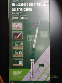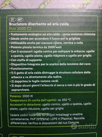 Potenza 2000W, temperatura max 650°C. Brucia le erbacce distruggendo la radice. Utilizzabile anche come sverniciatore e per l'accensione del BBQ. Articolo NUOVO, MAI utilizzato