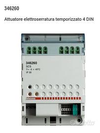 Attuatore elettroserratura temporizzato in custodia modulare 4 DIN. Consente di accendere luci, aprire cancelli o di gestire serrature elettromagnetiche, apertura porta temporizzata e stato serratura (con contatto NC). Il dispositivo deve essere configurato attraverso l'inserimento fisico dei configuratori.