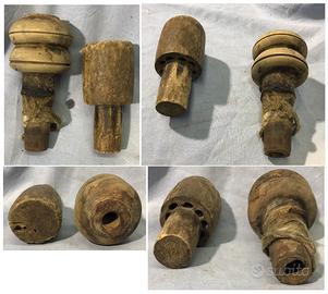 2) 2 antichi tappi in legno, molto particolari, il più grande dei due più che tappo è un rubinetto perchè è forato al centro e all'interno vi andava un altro legno che si metteva e toglieva a incastro all'occorrenza; venivano utilizzati anche come tappi per bummuli e quartare in ceramica