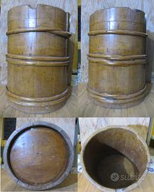 1) Antica burnia in legno con particolari fili che si intrecciano tutt'attorno usata principalmente per contenere il mosto; misura cm. 36 x 28 diametro inferiore x 25,5 diametro superiore