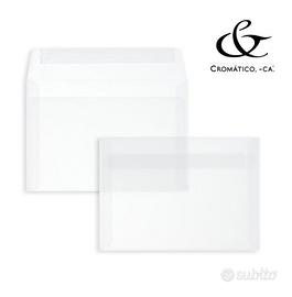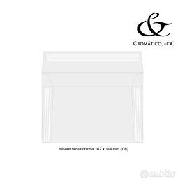 Marca Cromàtico, -ca® sono realizzate in carta semi-trasparente Extra Bianca da gr 100/mq, le misure della singola busta chiusa sono 162x114 mm (C6), hanno la strip adesiva per la chiusura.