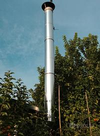 Caldaia a legna funzionante e revisionata, veduta con pannello regolatore e 5 metri di canna fumaria in acciaio inox con coibentazione esterna anticondensa.