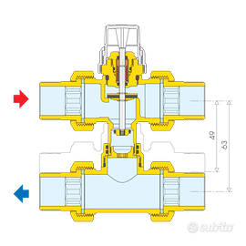 Valvola di zona a tre vie con tee di by-pass.