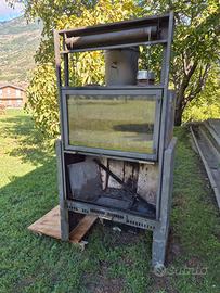 Caminetto monoblocco Palazzetti, accesso frontale, posta scorrevole, motore per ventilazione forzata con scatola comandi, bocchette fuoriuscita aria. Con refrattario e grate di ricambio nuove.