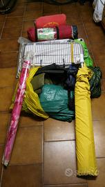 Tenda 3 posti, fornello a gas, attacco riduttore per bombola, sacco a pelo, griglia, tavolino basso, accessori vari (riduttore presa, prolunga, cavi elettrici e ciabatta multi presa, lampada interna elettrica).