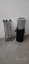 tavolo totalmente in alluminio, apertura gambe a fisarmonica e posizionamento piano del tavolo in pochi secondi, con robusta sacca di trasporto originale, gambe regolabili separatamente in altezza come da particolare in foto per stabilità e piano a livella su qualunque terreno anche sconnesso o leggermente scosceso. Dimensioni 70 x 120.