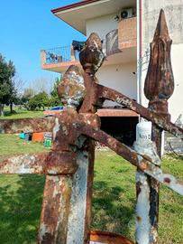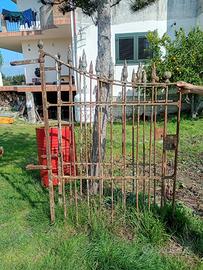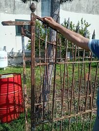 cancello pesante, senza saldature eccetto la chiusura posticcia da eleminare dopo eventuale restauro. Due fiamme sono spezzate, una si puo ricomporre l'altra manca. E tutto originale anche le cerniere.