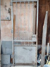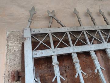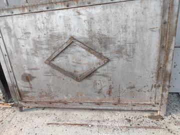 Vendo cancello antico in ferro pieno a tre ante con apertura pedonale centrale. Larghezza complessiva di 3,20 m circa; altezza 2,35 m circa