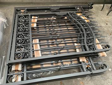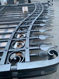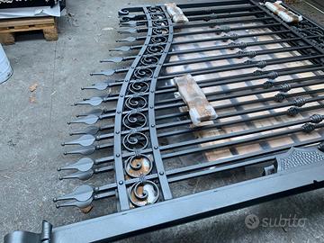 Disponibilità in pronta consegna di cancelli in ferro battuto a 2 ante battenti, zincati a caldo, nelle misure base 3,5m e 4m (altezza massima sulla punta 2m). Struttura con paletti in ferro battuto pieno di sezione quadro 14mm, fascette, ricci e ribattini. Completo di cardini e piastre di ancoraggio. Possibilità di acquistare il cancelletto pedonale abbinato a 700 euro. Verniciatura esclusa. Consegna disponibile in tutta Italia da calcolare in base all'indirizzo di scarico.