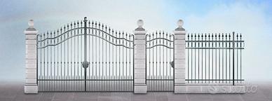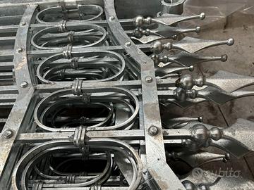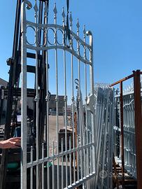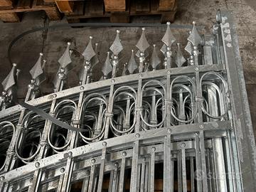 Cancelli in ferro battuto in pronta consegna 2 ante battenti, zincati a caldo, misure base 3,5m e 4 m, (altezza sulle spalle 2,1m e altezza sulla punta 2,7m). Struttura con bacchette in quadro pieno 14 mm, fascette, ovali e ribattini. Il cancello viene fornito completo di cardini e piastre di ancoraggio. Possibilità di acquistare a parte il cancelletto pedonale a 750 euro. Verniciatura esclusa. Consegna disponibile in tutta Italia da calcolare in base all'indirizzo di scarico.