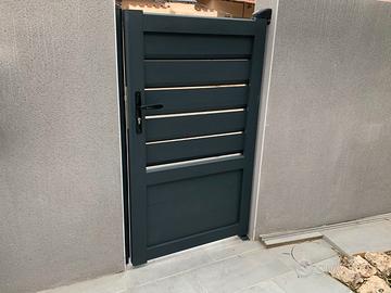 Cancello Pedonale a Battente: Comprende pannelli misti, maniglia, serratura con 3 chiavi, cerniere superiori e inferiori, e fermo.