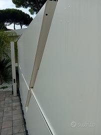 Vendo cancello scorrevole, telaio interno zincato a caldo, lamiere esterne sagomate zincate saldate a telaio, verniciatura a polvere con fondo e colore ral 9010 bianco. Disegno particolare con parti laterali piu strette (80 mm) rispetto alla parte a "V" (120 mm come da foto), misure lungh 3600 mm (+400 di coda) x h 1730 da terra, apertura Visto da esterno, da sinistra verso destra.
