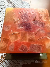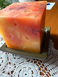 Candela cubo 10x10 - arancio/rosso - Nuova- con piattino in ceramica -