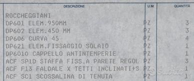 3 elementi da 1 metro. 3 da mezzo. 4 curve 45° . Un elemento da passaggio soletta. 3 staffe varie. Un terminale cappello a botte. Un fondale per tetti inclinati. 1 scossalina sostenuta. In tutto circa 6 metri.