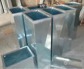 Canne fumarie o condutture nuove per cucine e ristoranti, 6 moduli da 2 metri l'uno a base rettangolare, 30x 15 cm, realizzati in lamiera zincata spessa 1 mm. e completi di comignolo antipioggia. Ideali per percorsi interni a case e locali, oppure all'esterno. Ritiro a mano.