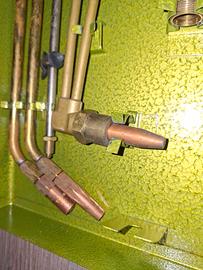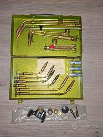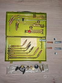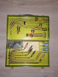 Froverkit 2 originale della SAF-FRO, risalente proprio a circa 20-30 anni fa. La scatola metallica con quella particolare verniciatura a polvere verde "martellata" è l'elemento che lo contraddistingue dai modelli più recenti (che sono solitamente blu o in plastica). Ecco l'analisi dei componenti che hai nella valigetta: Parte Superiore (Il "motore" del kit) * Impugnatura Principale (al centro): È il corpo in ottone dove colleghi i tubi di ossigeno e acetilene. Si legge chiaramente la scritta in rilievo (probabilmente "Cannello Frover"). Noterai le due manopole laterali per regolare la fiamma. * Lancia da Taglio (sopra l'impugnatura): È l'accessorio con la leva superiore. Serve per tagliare il ferro: una volta scaldato il metallo con la fiamma, premi la leva per dare il getto di ossigeno puro che "brucia" e taglia la lamiera. * Lancia da riscaldo/saldatura grande (in alto): Una lancia lunga per lavori che richiedono molto calore. Parte Inferiore (Le punte di precisione) * Set di 6 Lance da saldatura: Sono disposte in ordine di grandezza. Ogni lancia ha una portata diversa (espressa in litri/ora, solitamente da 63L a 400L o 630L). Più è grande la punta, più è spesso il metallo che puoi saldare o brasare. * Porta-ugelli (a destra): Quei tre cilindretti metallici contengono gli ugelli di ricambio per la lancia da taglio, con fori di diverso diametro per tagliare spessori differenti. Osservazioni sullo stato (20 anni dopo) * Materiali: Quel metallo è quasi indistruttibile. Anche se c'è un po' di ossidazione superficiale (la patina scura sull'ottone), è puramente estetica. * Punti critici: Guarda le basi delle lance (dove ci sono gli anellini neri). Quelli sono gli O-ring. Dopo 20 anni saranno sicuramente secchi. Prima di usarli, ti consiglio di cambiarli per evitare che il gas sfidi fuori dall'innesto. * Valore: Un kit del genere oggi è molto ricercato perché la qualità dell'ottone e la precisione dei rubinetti di un tempo sono superiori alle versioni moderne.