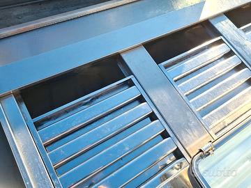 cappa lunga snack con illuminazione usata, si tratta di una cappa a parete in acciaio inossidabile completa di filtri, illuminazione e filtri di ricambio. non dispone di motore a bordo. dimensioni: 400X110cm h37cm, filtri 40X50cm