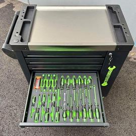magazzino fisico a Trieste e Frosinone Arriva il Carrello attrezzi – PRIMEUTENSILI – 4 cassetti completi di attrezzi con il prezzo più basso della rete! CARRELLO ATTREZZO PROFESSIONALE DI ALTA QUALITA’ completo di attrezzi in Chrome e vanadio CARRELLO CON 4 CASSETTI COMPLETI + 2 SPORTELLI e chiusura con chiave DESCRIZIONE PRODOTTO: 4 ruote con cuscinetti a sfera, di cui 2 ruote girevoli bloccabili Ø 120 mm e 2 ruote fisse Ø 120 mm. Ogni cassetto è assicurato singolarmente, con blocco estraibile. cassettone frontale con ripiani Ripiano / piano di appoggio in acciaio inox