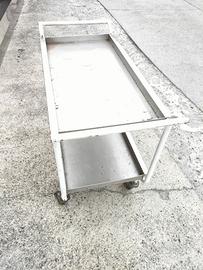 vendo carrello con doppio pianale in acciaio inox, struttura forte in ferro verniciati, con una ruota mancante, ideale anche per cucine, misure 80x50xh55