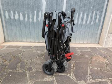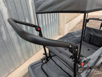 Ha una maniglia da trazione e un maniglione regolabile da spinta tipo passeggino, dotato anche i tetto parasole.