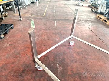 carrello industriale inox usato, si tratta di un telaio carrellato che portava un nastro motorizza. dispone di 4 ruote piroettanti con blocco, come nuovo. i punti di fissaggio sono inclinati. dimensioni: 290X543cm h57/64cm