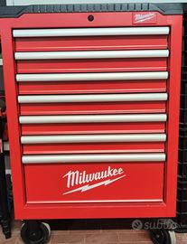 Carrello Milwaukee pari al nuovo, completo di termoformato cacciaviti, cricchetti e bussole 1/2" 3/8" ed 1/4" , serie chiavi combinate, pinze seeger reversibili, pinze generiche, martelli ecc