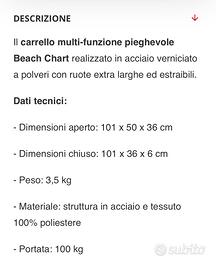 Carrello multifunzione Brunner. Per mare spiaggia, porta lettini/ombrellone,campeggio, giardino,fai da te. Usato buone condizioni completamente smontabile. Prezzo trattabile.