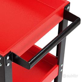 Carrello officina 3 ripiani in acciaio rosso 0.8 mm Tre ripiani • Verniciatura a polvere • Maniglia per semplificare il trasporto • Con parte inferiore dotata di 4 ruote • Maniglia: L30xP6,5cm • Portautensili laterale: L30xP6,5cm • Ripiani: L70xP35cm • Paratia: H5,5cm • Altezza tra ripiani: 24,5cm • Ruote: Ø7cmxL2,5cm Dimensioni: L71.5xP36.5xH73cm Peso netto: 7,7 kg Peso Lordo: 8,5kg