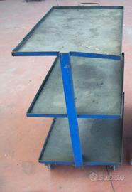 Vendo carrello porta attrezzatura in lamiera con ruote. I carrello ha 3 ripiani, solido, resistente e ben tenuto.