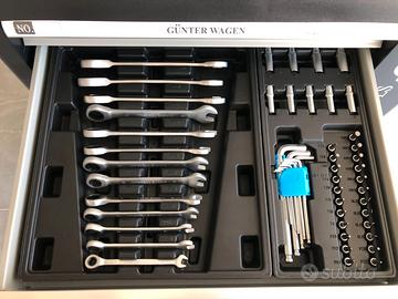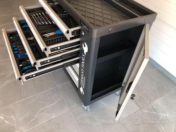 Carrello porta utensili Germany Tools completo di 4 cassetti attrezzati + 2 vuoti come in foto, vano laterale, serratura con chiave, sistema bloccaggio cassetti antiribaltamento.