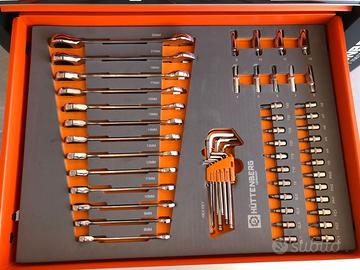 Carrello porta utensili Huttenberg completo di 5 cassetti attrezzati + 1 vuoto come visibile in foto, piano di lavoro in acciaio, vano laterale, serratura con chiave, sistema bloccaggio cassetti antiribaltamento.
