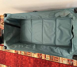 Carrello per campeggio o trasporto oggetti. Max 60kg. Dimensioni: lunghezza 90cm x larghezza 48cm x altezza 59cm Può essere usato anche per il trasporto di animali o bambini. Dotato di ruote in parte in gomma per andare su strada, ma allo stesso tempo utili per la sabbia in quanto sono anche in plastica dura. Inoltre, è completo di sacco per il trasporto quando il carrello viene ripiegato e telo per la copertura (nera) contro la pioggia.