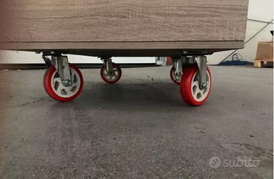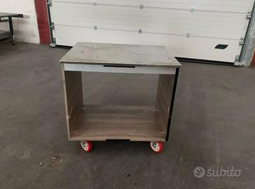 Carrello da esposizione in legno, finitura come da foto, piano in acciaio inox con 4 ruote, utilizzati per fiere ed esposizioni, frontalmente è dotato di fasce a strap che permettono la personalizzazione con pannelli a piacere.