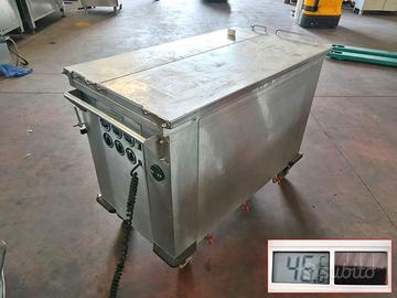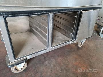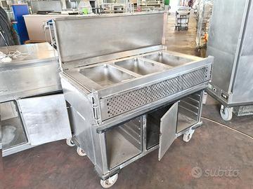 carrello termico distribuzione pasti caldi usato, si tratta di un carrello richiudibile in acciaio inox a bagnomaria funzionante utilizzato per il trasporto e il servizio di pasti caldi nella ristorazione. dotato di tre vani inferiori non funzionanti a cui purtroppo mancano due sportelli.