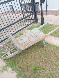 Carriola dal fondo piatto e ampio senza sponde laterali . il fondo è costituito da assi accostate e inchiodate termina sulla ruota con una sponda verticale . il cerchio e della ruota è in ferro i raggi sono in legno i due manici della carriola che sostengono il fondo sono collegati alle ruote terminando con l'impugnatura arrotondata . la carriola serve per trasportare il letame dalla stalla al letamaio o per piccoli trasporti di erba dal campo a casa lunga cm200 larga cm 60 ruota da cm 50 conservata vernice originale no spedizione ottima fioriera