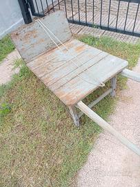 Carriola dal fondo piatto e ampio senza sponde laterali . il fondo è costituito da assi accostate e inchiodate termina sulla ruota con una sponda verticale . il cerchio e della ruota è in ferro i raggi sono in legno i due manici della carriola che sostengono il fondo sono collegati alle ruote terminando con l'impugnatura arrotondata . la carriola serve per trasportare il letame dalla stalla al letamaio o per piccoli trasporti di erba dal campo a casa