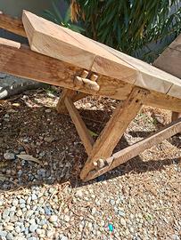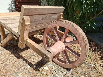 Carriola decorativa completamente in legno ad uso decorativo per giardino. Piano di appoggio sostituito in quanto non presente al momento del ritrovamento. Altri particolari originali. Ruota con battistrada in ferro.