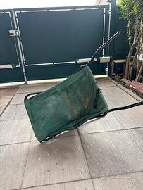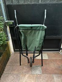 Carriola pieghevole, con telo verde molto resistente, quando è chiusa e’ comoda perché non prende tutto li spazio di una carriola normale