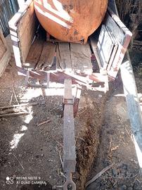 Carro agricolo con telaio in ferro pesante e rivestimento in legno, dotato di varricelli manuali per tiraggio funi anteriori e pistone manuale a vite per posizionamento.