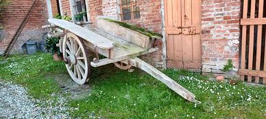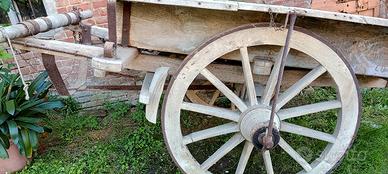 Vendo per mancanza di spazio questo carro da traino completo. Prodotto negli anni `50 dalla falegnameria Zaio a Lu Monferrato, ruote cerchiate in ferro, piano e sponde di legno, usurate dal tempo ma in buone condizioni, sempre stato in rimessa. Da esposizione o anche per attaccare animali nelle rappresentazioni paesane.