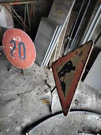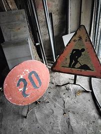 vendo coppia di cartelli stradali "lavori in corso" e limite "20km/h" in metallo, con piedistallo posteriore, utili per segnalare lavori in prossimità di passaggi pedonali o carreggiate