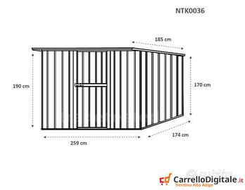 * Dimensioni esterne (incluso tetto): 2.60 m (Larghezza) x 1.85 m (Lunghezza) x