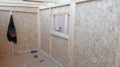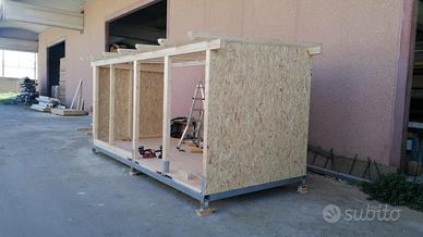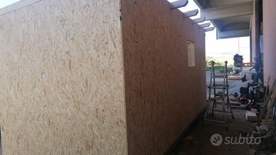 La struttura è realizzata in lamellare d’abete con tamponatura esterna in OSB, su base in ferro zincato per essere trasportata con gru.