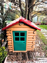 Vendo casetta gioco da esterno Chicco in plastica resistente agli agenti atmosferici, design effetto “baita” con tronchi, tetto rosso e porta verde con finestrelle.