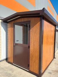 OCCASIONE A MAGAZZINO Casetta coibentata dim.: Largh. 2.160 x Lungh. 2.080 x Alt 2.240/2.440 mm. Descrizione: -Struttura in ferro verniciata colore testa di moro con pavimento in truciolare idrofugo sp. 18 mm con pellicola di linoleum PVC. -Parete spessore 40 mm coibentata, pannello finitura DOGATA EFFETTO LEGNO esterno e lato interno micronervato bianco grigio. -Tetto doppia pendenza in pannello coibentato mod. grecato sp. 40 mm colore rosso siena. -Porta esterna ½ cieca e ½ vetro trasparente con profili colore testa di moro, dim. 970x2000H mm. -Canali di gronda con scarico a terra e profili di finitura in lamiera preverniciata colore testa di moro. Prezzo escluso di trasporto.