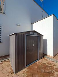 Vendesi casetta porta attrezzi da giardino misure 2 metri larghezza 1,20m profondità 1,85 m altezza. L'acquirente deve decidere se smontarla e portarla via oppure portarla via già montata