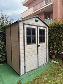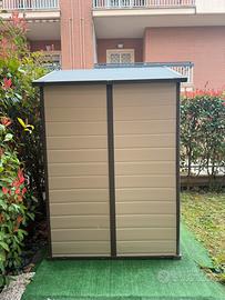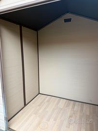 Casetta da giardino in PVC resistente, 226hx152px186l. Comprata da Amazon a 1600€. Molto spaziosa, da usare anche come ripostiglio/cantina in assenza di. Ben isolata anche in caso di mal tempo, non entra sporcizia .