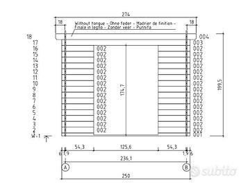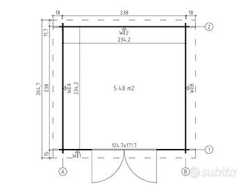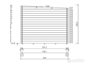 lunedi 30 siamo a Pitigliano consegna scontata, consegniamo comunque in Tutta Italia abbiamo molti modelli in pronta consegna guardate il ns sito Legno di abete nordico naturale Struttura con perline ad incastro spess. 19 mm Porta a doppia anta larghezza 250 cm parete 238cm tetto 276cm profondità 250 cm parete 238cm tetto 264cm Altezza al colmo: 211 cm Altezza in gronda: 200 cm (1940mm+45mm fondazioni 15mm tetto) Copertura tetto con perlina in abete da mm 15 guaina esclusa Pavimento perlinato spess. 18 mm con listelli impregnati in autoclave da 45x45 mm