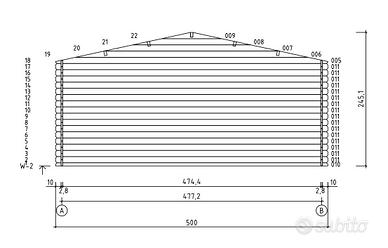 ABETE NORDICO NATURALE Struttura con perline ad incastro spess. 28 mm Porta a due ante da :149,4x185H cm 2 finestre 68.5x88.2 cm larghezza 500 cm parete 480cm tetto 518 profondità 380 cm parete 360cm, tetto 395cm Altezza nel colmo 245 cm Altezza in gronda : 194 cm IL PRODOTTO VIENE VENDUTO IN KIT DA ASSEMBLARE, INCLUDE : GUAINA BITUMINOSA GRIGIA TUTTA LA FERRAMENTA DI MONTAGGIO NON INCLUSO: PAVIMENTO (non disponibile) IMPREGNANTE GRONDAIA