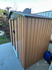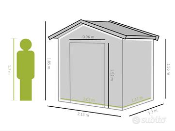 Casetta giardino in alluminio, in perfette condizioni, ancora con pellicola, con pavimentazione in legno fai da te. Misure: larghezza 2.13m, profondità 1.30m, altezza 1.85m Per lo smontaggio e il trasporto posso dare una mano organizzandoci. Prezzo non trattabile